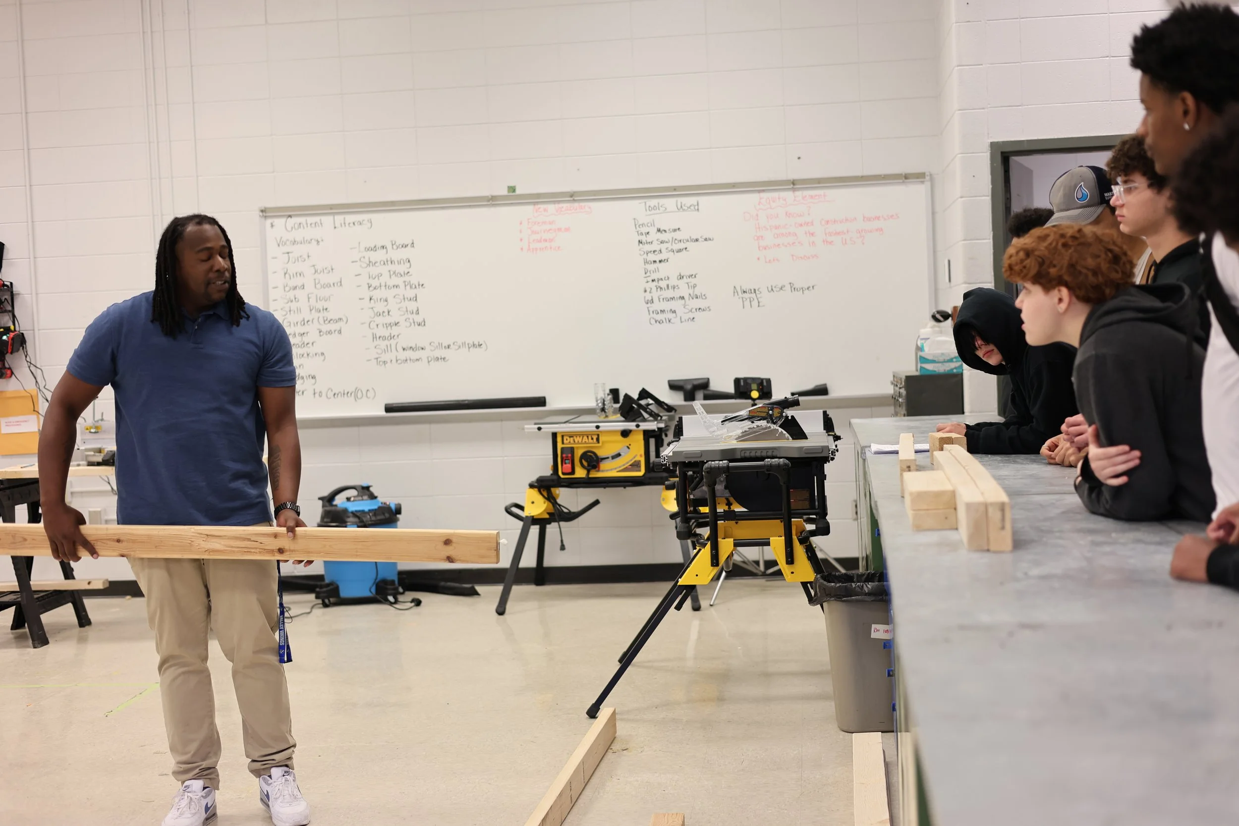 Inside KD's classroom, learning is dynamic and tangible. Students are actively building a "Scenario Hut"—a simulated house where they can tackle everything from drywall repair to laying different types of floors. "The sky's the limit on the amount of things that we will be able to do because we're building our simulation lab right now," KD explains.
